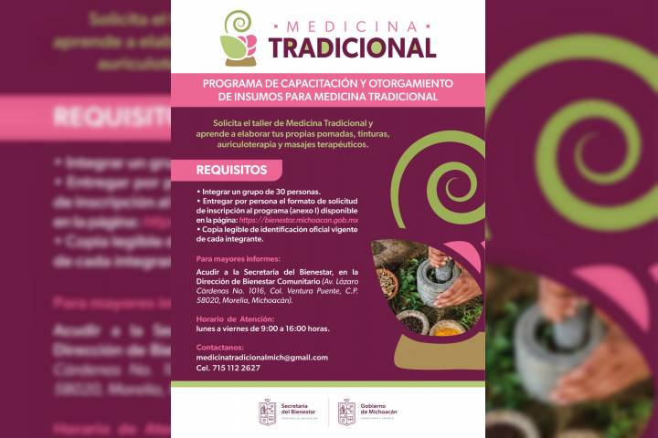 NOTICIAS 28/03/2023Fomenta Bienestar el autoempleo en mujeres en los 113 municipios de MichoacánLa Secretaría del Bienestar (Sedebi) convoca a las mujeres michoacanas de 18 años en adelante que no cuentan con un empleo y que estén interesadas en adquirir conocimientos sobre la medicina tradicional, a solicitar una capacitación en su municipio de manera gratuita.