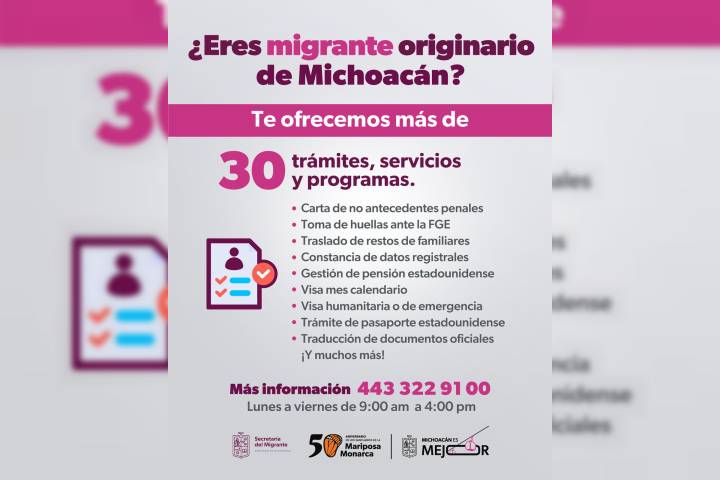 NOTICIAS 23/04/2025Más de 30 trámites, servicios y programas gratuitos para migrantes michoacanosLa Secretaría del Migrante (Semigrante) pone a disposición más de 30 trámites, programas y servicios de manera totalmente gratuita, con el objetivo de acercar los derechos, servicios y oportunidades a las y los michoacanos en el exterior, en retorno y a sus familias.