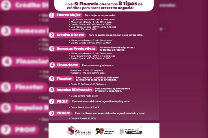 NOTICIAS 03/04/2025Conoce estas ocho opciones crediticias para impulsar tu negocio: Sí FinanciaEl Sistema Integral de Financiamiento para el Desarrollo de Michoacán (Sí Financia) ofrece ocho opciones crediticias para el impulso de proyectos productivos de los sectores artesanal, comercial, industrial, primario y servicios, informó Areli Gallegos Ibarra, directora general de la institución.