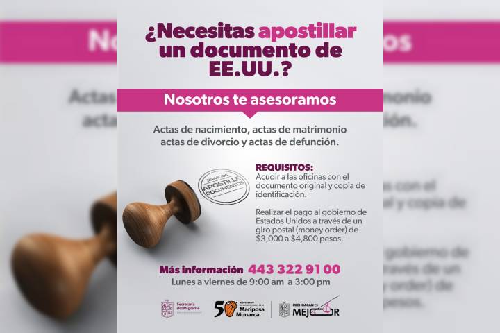 NOTICIAS 26/03/2025Semigrante facilita apostilla de documentos de EUA para uso en MéxicoLa Secretaría del Migrante (Semigrante) pone a disposición el servicio de apostilla de documentos oficiales provenientes del Registro Civil de Estados Unidos, lo que certifica que la firma o sello del documento fue emitido por un funcionario público, pueden ser actas de nacimiento, de matrimonio, divorcio o defunción, para permitir su uso en México.
