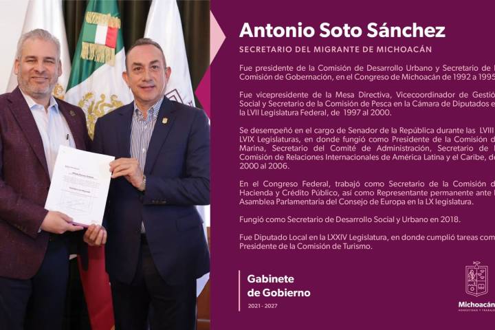 NOTICIAS 01/02/2025Bedolla nombra a Antonio Soto como nuevo secretario del MigranteEl gobernador Alfredo Ramírez Bedolla designó a Antonio Soto Sánchez como nuevo secretario del Migrante en sustitución de Andrea López Contreras.