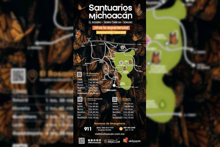 NOTICIAS 17/11/2024Conoce las rutas para llegar a los Santuarios de la MonarcaAnte la apertura de los Santuarios de la Mariposa Monarca de Sierra Chincua, El Rosario y Senguio, la SecretarÃa de Turismo del estado publicó a través de sus redes sociales una imagen explicativa de la ruta y el tiempo de trayecto para arribar a dichos recintos, a fin de guiar a los miles de turistas y visitantes que arribarán en la presente temporada.