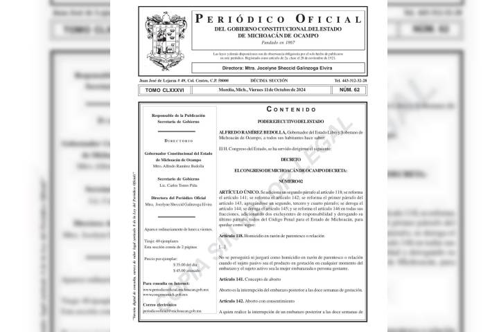 NOTICIAS 11/10/2024Se publica en Periódico Oficial decreto que despenaliza el abortoEl Gobierno de Michoacán publicó en el Periódico Oficial la reforma legal aprobada por el Congreso local, mediante la cual se despenaliza el aborto en la entidad, para entrar en vigor a partir del sábado 12 de octubre de este año.