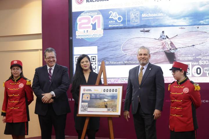 NOTICIAS 14/10/2024Develan Bedolla y la Lotería Nacional "cachito" conmemorativo por los 200 años de MichoacánA la voz del "premio mayor" de las niñas gritonas, el gobernador Alfredo Ramírez Bedolla y el director de la Lotería Nacional, Marco Antonio Mena Rodríguez, develaron el billete conmemorativo por los 200 años de Michoacán como Estado Libre y Soberano, con un premio mayor de 21 millones de pesos.