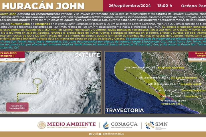 Se mantiene una vigilancia y atención permanente ante el paso del huracán John por la Costa Michoacana, informó la Secretaría de Gobierno, a través de la Coordinación Estatal de Protección Civil. El corte de las 18:00 horas, el meteoro se localizaba frente a la Costa Michoacana a 90 kilómetros al oeste de Lázaro Cárdenas, con vientos máximos sostenidos de 120 km/h, rachas de 150 km/h y desplazamiento hacia el noroeste a 5 km/h. ...
