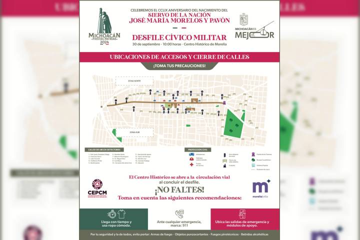 Con motivo del Desfile Cívico Militar por el 259 aniversario del natalicio de José María Morelos y Pavón, el próximo lunes 30 de septiembre, la Secretaría de Seguridad Pública (SSP) habilita un dispositivo vial mediante 15 accesos controlados y cierres a la circulación vehicular en el Centro de Morelia. A lo largo de la avenida Francisco I. Madero, desde el monumento a Lázaro Cárdenas hasta la fuente de Las Tarascas, se instalará u...