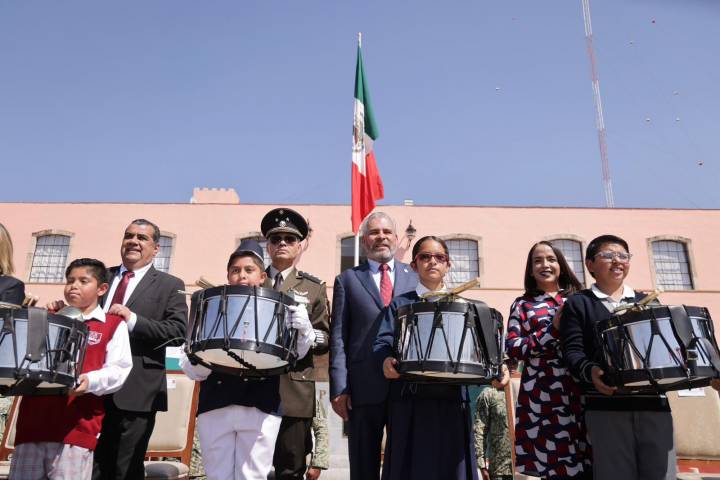 Junto con autoridades de las fuerzas armadas y los secretarios de Gobierno, Elías Ibarra Torres y de Educación, Gabriela Molina Aguilar, el mandatario también entregó banderas y equipo para bandas de guerra de escuelas de nivel básico.... Ver más...