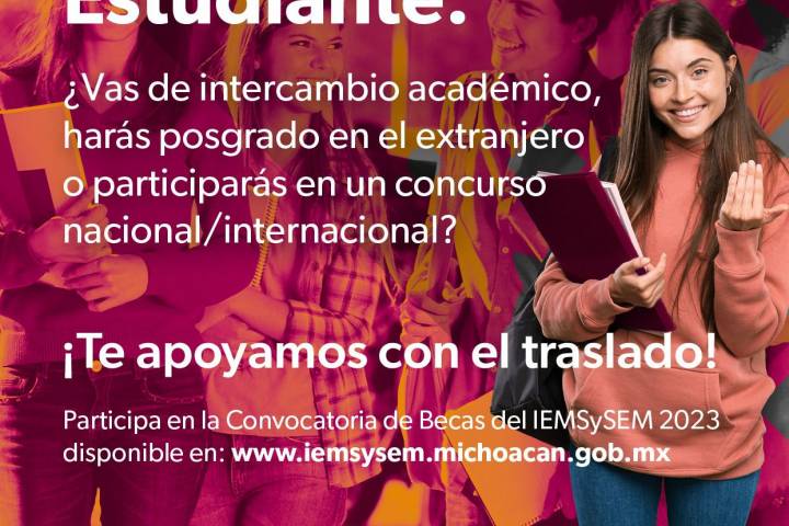 NOTICIAS 19/11/2023Ofrece IEMSySEM becas de transporte internacional a estudiantes de prepa y universidad Por primera vez, Michoacán cuenta con un fondo de becas para apoyar a jóvenes que cursan estudios de bachillerato, carreras técnicas y de nivel superior, con gastos de traslado a competencias nacionales e internacionales, prácticas y cursos académicos, con un monto de hasta 30 mil pesos por estudiante.