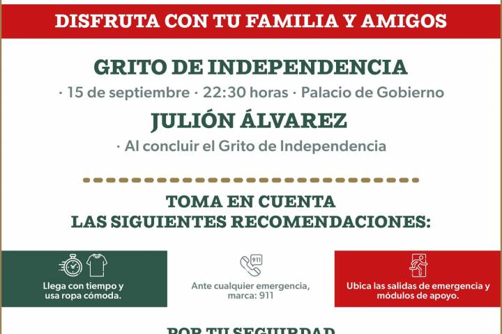 De cara a la celebración del Grito de Independencia el 15 de septiembre y al mega concierto que ofrecerá el artista Julión Álvarez, representantes de los tres órdenes de gobierno establecieron prot... Ver más...
