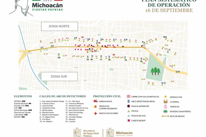 NOTICIAS 15/09/2023Listo, plan sistemático de operación para el desfile del 16 de septiembre, en Morelia: SSP Con la finalidad de garantizar la seguridad de las y los asistentes al primer cuadro de la ciudad de Morelia; de agilizar la vialidad y evitar cualquier incidente durante el desfile patrio, la Secretaría de Seguridad Pública (SSP), determinó el plan sistemático de operación, en amplia coordinación con los tres ordenes de gobierno.