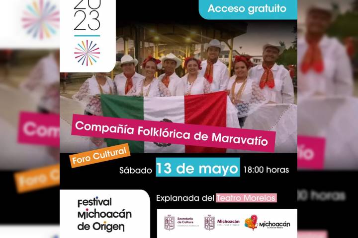 NOTICIAS 13/05/2023Este sábado llega la Compañía Folklórica de MaravatíoLa Secretaría de Cultura de Michoacán (Secum) anuncia la participación dancística de jóvenes entusiastas de la Compañía Folklórica de Maravatío, que se realizará este sábado 13 de mayo en el foro cultural del Festival Michoacán de Origen.