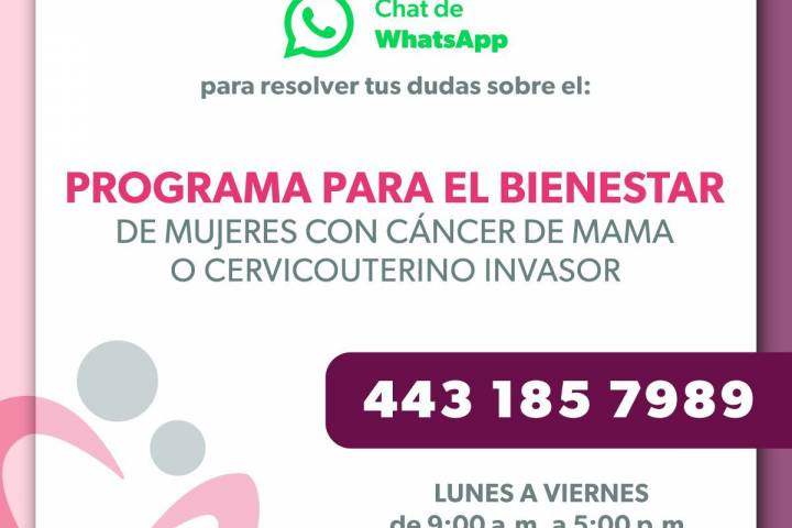 NOTICIAS 15/03/2023Ofrece Bienestar información por WhatsApp del programa mujeres con cáncerEl Gobierno del Estado, a través de la Secretaría del Bienestar (Sedebi), puso a disposición una línea de WhatsApp que permitirá obtener respuestas inmediatas a las preguntas más comunes sobre el Programa para Mujeres con Cáncer de Mama y/o Cervicouterino Invasor. Las interesadas pueden solicitar información al número 443 185 7989, de lunes a viernes, de 09:00 a 17:00 horas
