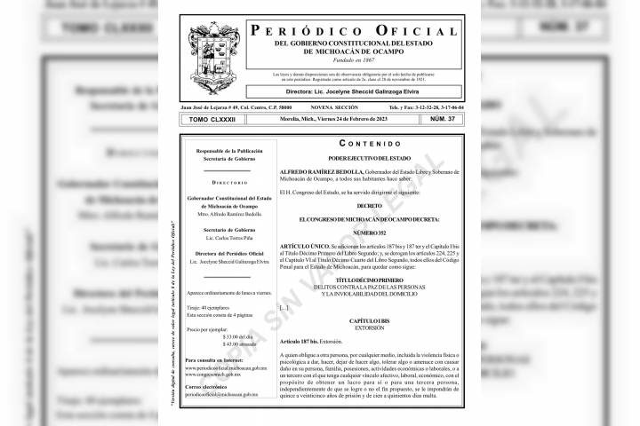 NOTICIAS 02/03/2023Entra en vigor Reforma de Bedolla en materia de extorsión; hasta 25 años de prisión para delincuentesEste jueves entró en vigor la reforma impulsada por el gobernador Alfredo Ramírez Bedolla al Código Penal para hacer más eficiente el combate al delito de extorsión en Michoacán, informó el secretario de Gobierno, Carlos Torres Piña.