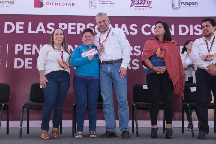 NOTICIAS 03/12/2022Michoacán se suma al proyecto humanista del presidente López Obrador: BedollaEl gobernador Alfredo Ramírez Bedolla entregó de forma simbólica tarjetas de la Pensión Universal para el Bienestar a Personas con Discapacidad de 30 a 64 años de edad, que ascienden a una inversión de 9.5 millones de pesos.