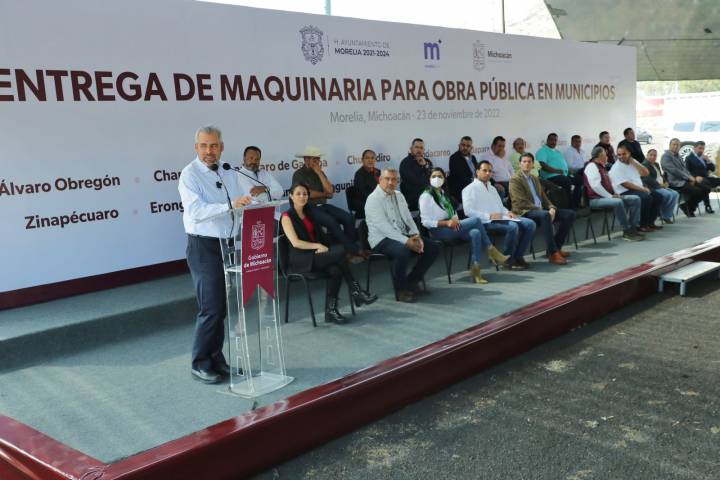 NOTICIAS 23/11/2022En Morelia, concluye entrega de maquinaria para municipios; 328 mdp invertidos: Bedolla Con la entrega de maquinaria para ejecutar obra pública en 20 municipios, el gobernador Alfredo RamÃrez Bedolla concluyó hoy la asignación de unidades cuya inversión fue de 328 millones de pesos para la compra total de 79 equipos.
