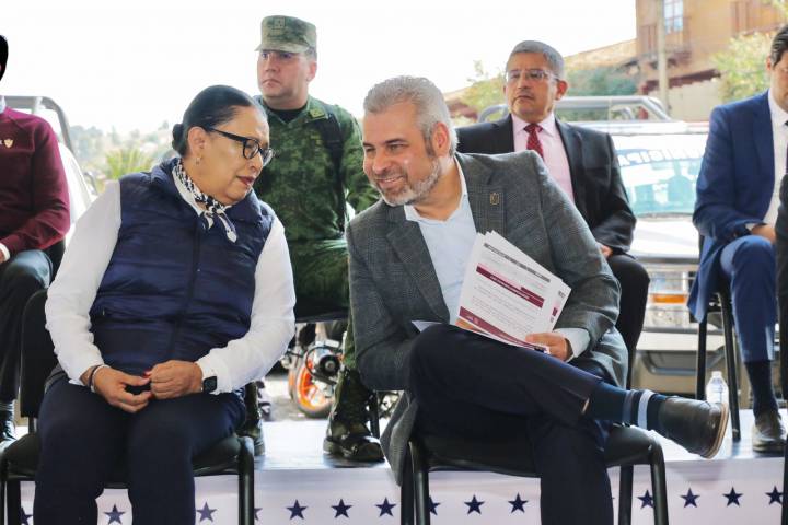 NOTICIAS 17/11/2022Entrega Bedolla segunda etapa de FortapazEl gobernador Alfredo Ramírez Bedolla, acompañado de Rosa Icela Rodríguez Velázquez, secretaria de Seguridad y Protección Ciudadana del Gobierno Federal, encabezó la segunda entrega de patrullas y equipamiento a municipios que forman parte del Fondo de Fortalecimiento para la Paz (Fortapaz).