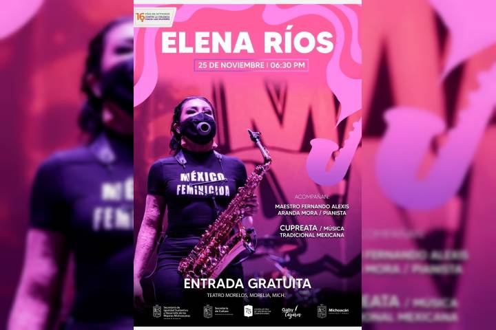 NOTICIAS 16/11/2022Michoacán conmemorará 25N con concierto de la saxofonista María Elena RíosLa Secretaría de Igualdad Sustantiva y Desarrollo de las Mujeres Michoacanas (Seimujer), en coordinación con la Secretaría de Cultura del Estado de Michoacán (Secum) y la diputada Gabriela Cázares Blanco, invita al concierto de la saxofonista María Elena Ríos, el próximo 25 de noviembre.