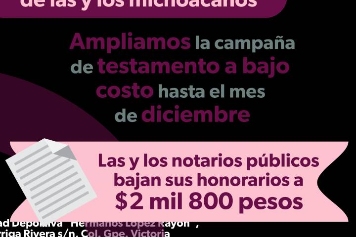 NOTICIAS 04/11/2022Extienden plazo para tramitar el testamento a bajo costo hasta el 31 de diciembre En suma a las acciones de lucha contra la carestía, que el Gobierno del Estado de Michoacán ha implementado en los últimos meses, el Colegio de Notarios de Michoacán, A.C., consiente de la situación económica por la que atraviesa, el país y el estado, extiende hasta el último día de diciembre del presente año, el trámite del testamento universal a bajo costo.