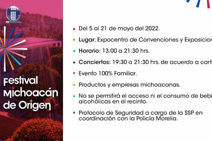 NOTICIAS 02/05/2022Todo listo para que el 5 de mayo inicie el Festival Michoacán de Origen La mañana de este lunes, en rueda de prensa encabezada por el gobernador de Michoacán, Alfredo RamÃrez Bedolla, se dio a conocer como se llevara a cabo el Festival Michoacán de Origen, del 5 al 22 de mayo en el centro de Convenciones Y Exposiciones de Morelia, (Ceconexpo).