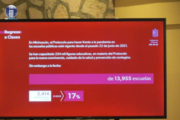 NOTICIAS 04/10/2021Consejo de Seguridad en Salud debe valorar condiciones para regreso a clases: GobernadorEl Gobernador, Alfredo Ramírez Bedolla anunció que este próximo viernes se valorará con el Consejo de Seguridad en Salud el panorama epidemiológico por COVID-19 a fin de determinar si es obligatorio o no el regreso a clases en Michoacán.