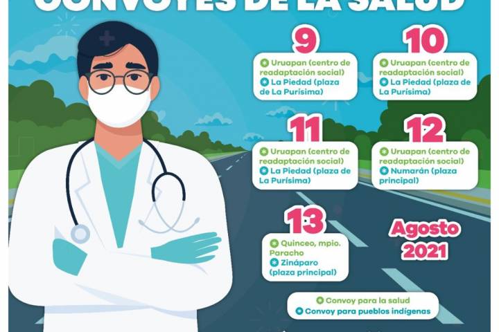 NOTICIAS 08/08/2021Recorrerán los Convoyes de la Salud cinco municipios esta semanaEn aras de acercar servicios médicos gratuitos a la población, la SecretarÃa de Salud de Michoacán (SSM), desplegará los Convoyes de la Salud en cinco municipios, del 9 al 13 de agosto.