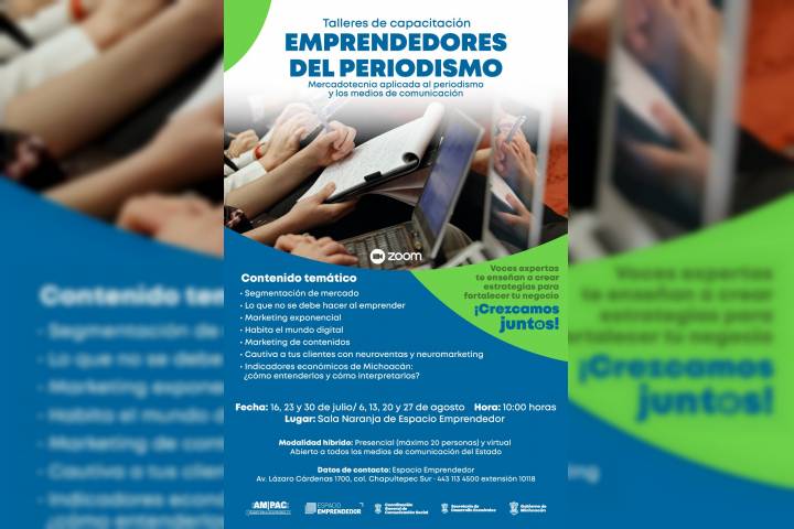 NOTICIAS 14/07/2021Inician este viernes los talleres para "Emprendedores del Periodismo" en Espacio EmprendedorCon el curso sobre ·Marketing Exponencial·, que será ofrecido por el mercadólogo Alberto Granja, iniciarán los talleres "Emprendedores del Periodismo", organizados por el Gobierno de Michoacán a través de la Secretaría de Desarrollo Económico (Sedeco) y la Coordinación General de Comunicación Social.