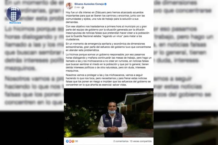 El gobernador del estado, Silvano Aureoles Conejo, y el secretario de gobierno, Carlos Herrera Tello, reportaron que tras diálogos entablados con ejidatarios de Zitácuaro que se manifestaban por la creencia de que la Guardia Nacional buscaba contagiar un virus, se logró que se abrieran caminos de manera pacífica.