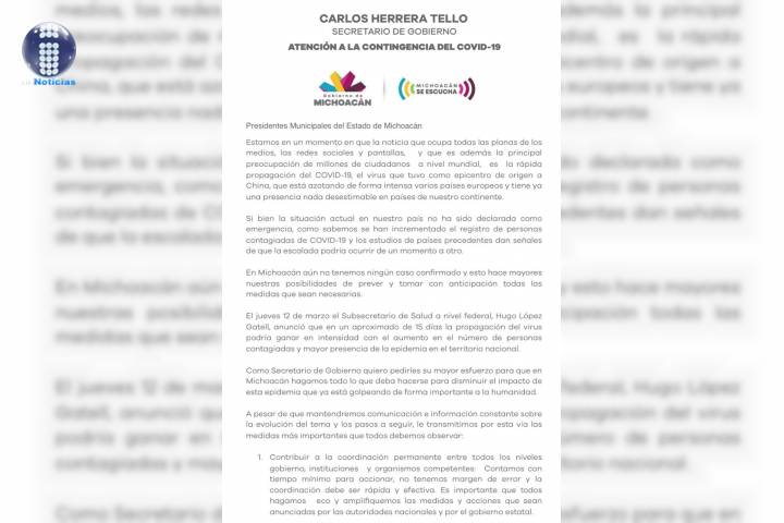 NOTICIAS 16/03/2020Llama Carlos Herrera a ediles a sumar esfuerzos de prevención por Coronavirus Para prevenir la propagación del Coronavirus (Covid-19) en Michoacán, se debe accionar sin margen de error, por ello, se sostendrá una reunión de urgencia con todos y todas las presidentas municipales, anunció el secretario de Gobierno, Carlos Herrera Tello.