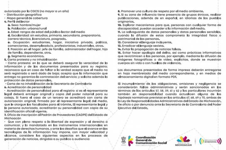 NOTICIAS 05/01/2020Publicidad institucional con garantía de equidad, inclusión, sustentabilidad y respeto a derechos humanos: CGCS En un hecho que marca un precedente jurídico a nivel nacional, el Gobierno de Silvano Aureoles Conejo, presentó los nuevos lineamientos que regirán la contratación de publicidad institucional, los que garantizan y salvaguardan la difusión de un lenguaje incluyente, eficaz, con enfoque sustentable y respeto absoluto a los derechos humanos, cerrando la puerta a la apología del delito.