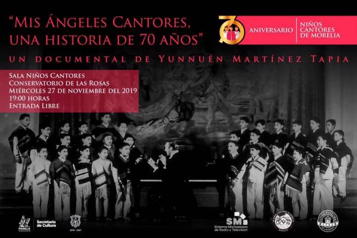 NOTICIAS 25/11/2019Proyectarán en documental, historia de los Niños Cantores de Morelia "Mis ángeles cantores. Una historia de 70 años", proyecto cinematográfico dedicado a la historia del Coro de los Niños Cantores de Morelia, será proyectado este miércoles 27 de noviembre en la Sala de Niños Cantores del Conservatorio de las Rosas a las 19:00 horas.