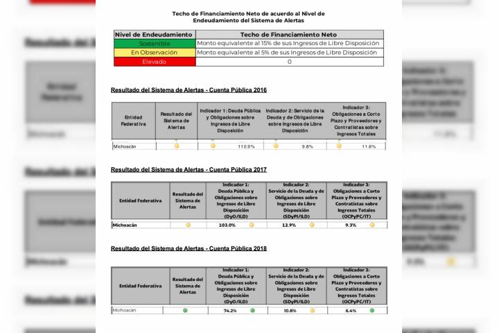 NOTICIAS 12/08/2019Michoacán, en semáforo verde de SHCP por deuda sostenible Como resultado del refinanciamiento de la deuda pública que realizó el Gobierno del Estado, encabezado por Silvano Aureoles Conejo, Michoacán obtuvo semáforo verde o un endeudamiento sostenible, en el sistema de alertas de la SecretarÃa de Hacienda y Crédito Público (SHCP).