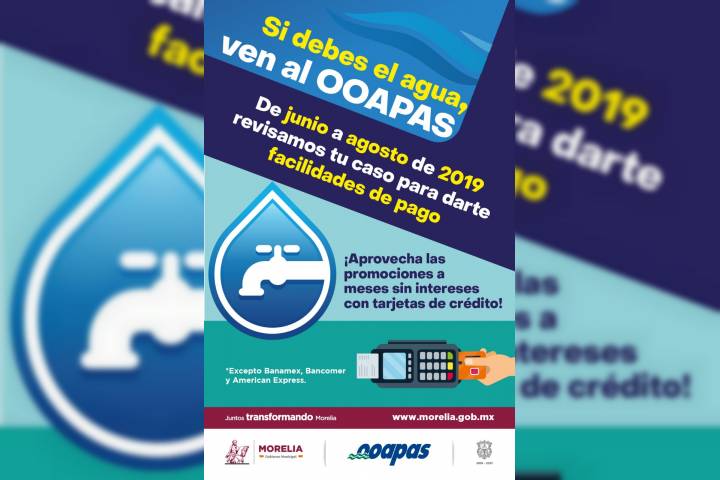 NOTICIAS 11/06/2019El OOAPAS arranca programa para incentivar el pago del agua De junio a agosto, El Organismo Operador de Agua Potable Alcantarillado y Saneamiento de Morelia (OOAPAS) activará el programa "Si debes el agua, ven al OOAPAS", donde se darán facilidades a los usuarios que presenten rezago en su recibo del agua para que puedan ponerse al corriente.