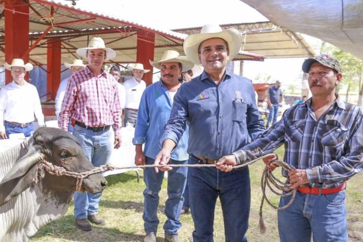 Al hacer entrega de certificados a quienes adquirieron sementales, en el Rancho Ganadero de Tipítaro, Aureoles Conejo apu... Ver más...
