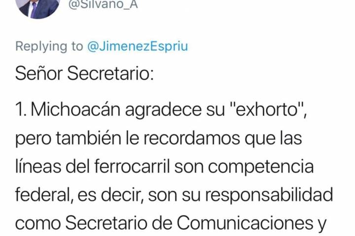 Luego de que el secretario de Comunicaciones y Transportes (SCT) del Gobierno Federal, Javier Jiménez Espriú, exhortara a la administración estatal y al magisterio michoacano a resolver el conflicto que hay en la entidad para no afectar a terceros, Silvano Aureoles Conejo, gobernador del estado le respondió que es competencia de la Federación desbloquear las vías del tren que están tomadas por los maestros y que mantienen varada una gran... Ver más...