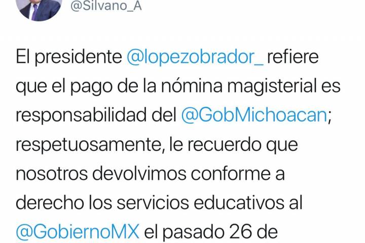 "Esta en manos del Gobierno de la Répública pagar a las y los maestros de nivel básico. Nosotros estamos listos para aportar la parte que nos corresponde como se acordó con la @SEP_mx y que después se desistió", así fue que respondió el gobernador, Silvano Aureoles Conejo al Presidente, Andrés Manuel López Obrador.