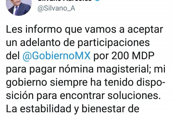 "Les informo que vamos a aceptar un adelanto de participaciones del @GobiernoMX por 200 MDP para pagar nómina magisterial; mi gobierno siempre ha tenido disposición para encontrar soluciones. La ... Ver más...