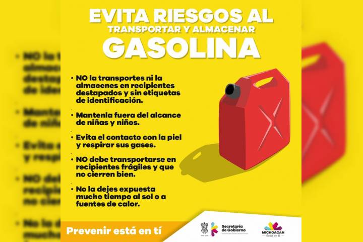 NOTICIAS 18/01/2019Reitera Segob riesgos de almacenar y transportar gasolina en recipientesLa Secretaría de Gobierno, a través de la Coordinación Estatal de Protección Civil, reitera a la población en general sobre los riesgos de transportar y almacenar gasolina.
