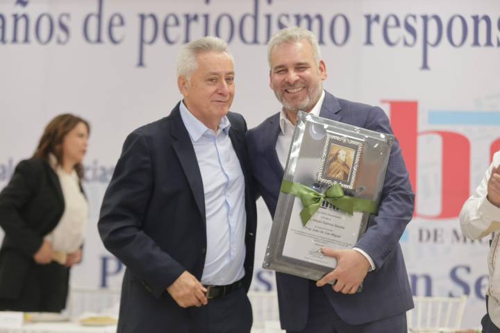 NOTICIAS 21/10/2025Distingue periódico ABC de Michoacán a Bedolla con reconocimiento Fray Juan de San MiguelEl gobernador Alfredo RamÃrez Bedolla recibió el reconocimiento Fray Juan de San Miguel, que entrega cada año el periódico ABC de Michoacán en el marco de su aniversario, de manos de su presidente y director general, Pedro Andrade González.