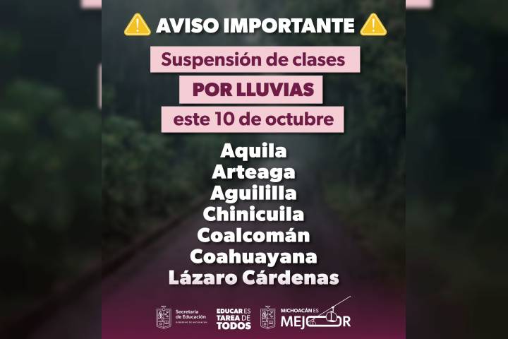 NOTICIAS 09/10/2025Suspensión de clases en 7 municipios de la Sierra-Costa por lluvias: Gabriela MolinaLa secretaria de Educación, Gabriela Molina, anunció la suspensión de actividades escolares para este viernes 10 de octubre en siete municipios de la región Sierra-Costa. La medida preventiva se toma debido a los efectos del fenómeno meteorológico "Raymond", que se intensificó a tormenta tropical frente a las costas del Pacífico y se espera que genere lluvias intensas, tormentas eléctricas y oleaje elevado en la región.