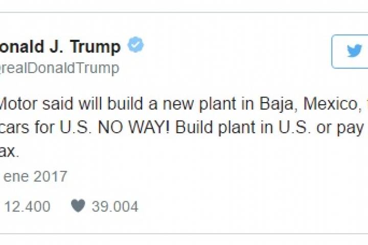 NOTICIAS 05/01/2017Trump amenaza a Toyota con impuesto fronterizo si abre planta en MéxicoEl presidente electo de Estados Unidos, Donald Trump, amenazó este jueves a la automotriz japonesa Toyota Motor Corp con imponerle un fuerte arancel si construye sus modelos Corolla para el mercado estadounidense en una planta en México.