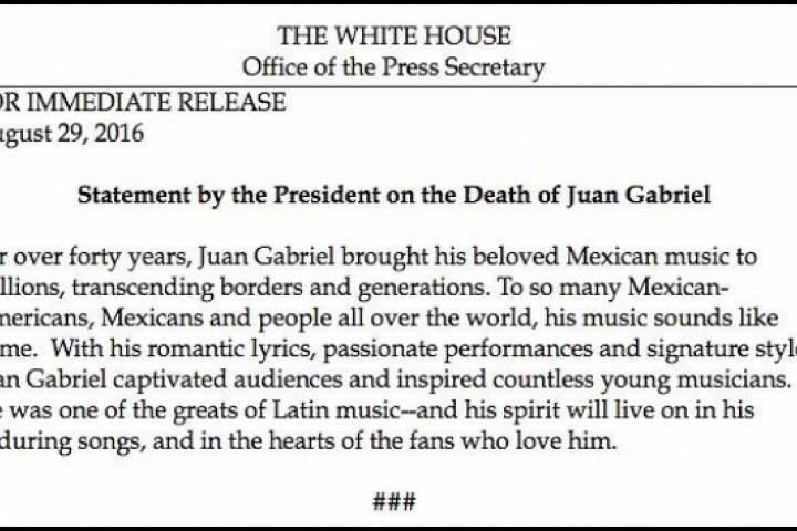 NOTICIAS 29/08/2016Obama expresa condolencias por muerte de Juan GabrielEl presidente de Estados Unidos, Barack Obama, expresó hoy su tristeza por el fallecimiento del compositor y cantente Juan Gabriel, a quien describió como "uno de los grandes" de la música latina.