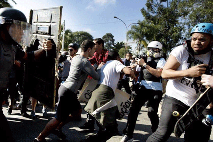Decenas de manifestantes se reunieron esta mañana cerca de una estación de Metro en esta megalópolis, cargando una pancarta que decía "Si no tenemos derechos, no habrá Copa".
