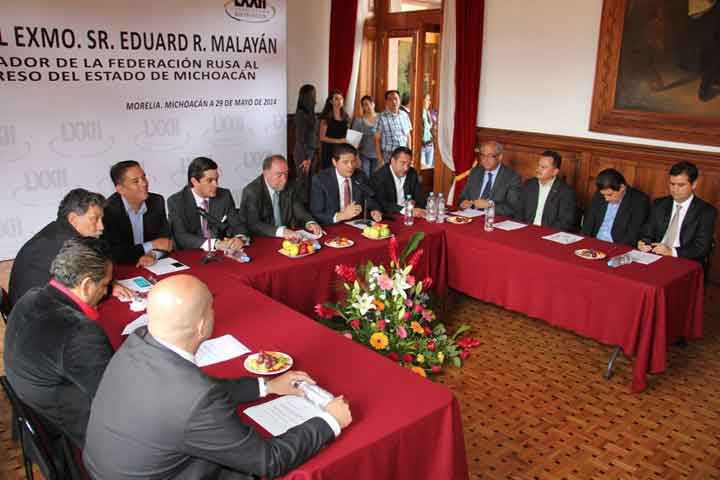 NOTICIAS 29/05/2014Embajador de Rusia busca expandir las relaciones con México El embajador de Rusia, Eduard Malayán, aseguró que la visita a México en especificó a la capital michoacana con legisladores locales fue para comprobar la situación que vive el estado, asà como fortalecer relaciones y entendimiento mutuo para ver las posibilidades turÃsticas y empresarial.