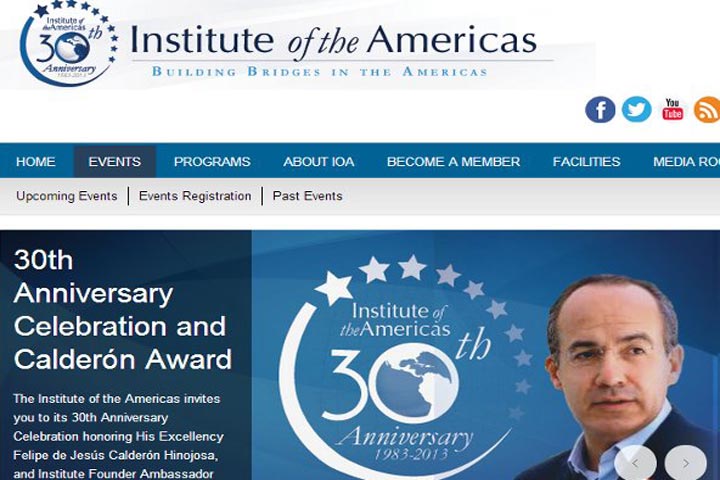 NOTICIAS 18/11/2013Felipe Calderón recibe esta noche el premio "Liderazgo en las Américas"Felipe Calderón Hinojosa ex-presidente de México estará de visita este lunes en San Diego donde recibirá el galardón "Liderazgo en las Américas" por lidiar con la crisis económica mundial y su impacto en México, así como por confrontar la violencia en el país desatada por el narcotráfico que otorga el Instituto de las Américas de la Universidad de California en San Diego, según se lee en la página web de la institución.