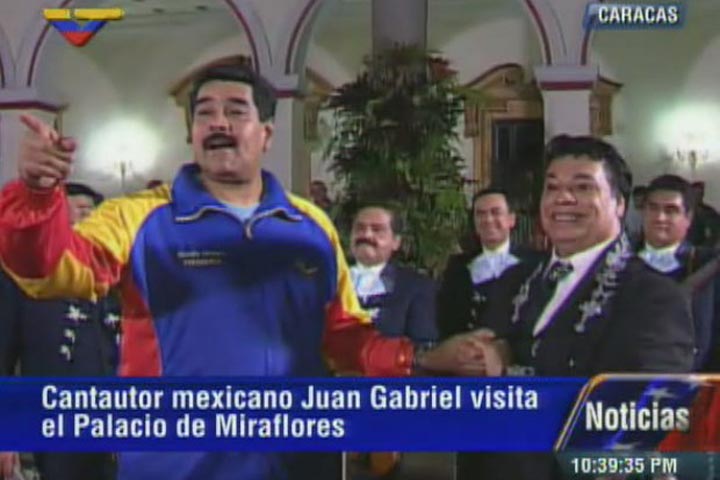 NOTICIAS 23/11/2013Juan Gabriel le canta las mañanitas a Nicolás Maduro Presidente de VenezuelaJuan Gabriel le cantó ''las mañanitas'' al presidente Nicolás Maduro, quien este sábado cumple 51 años y recibió la noche del viernes al popular músico, quien ofrecerá un concierto gratuito el domingo en Caracas.