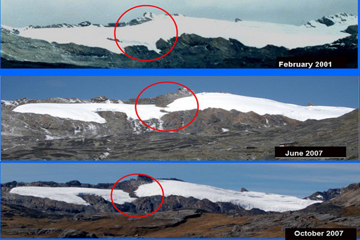 NOTICIAS 14/04/2013Glaciares de Perú se están derritiendoLas grandes masas de hielo que forman los glaciares peruanos, cuyos núcleos se constituyeron hace más de mil 800 años, han comenzado a derretirse de manera irreversible en las últimas décadas por el calentamiento global.