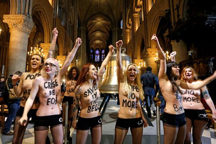 Un grupo de feministas de la organización ucraniana Femen se mostró hoy en "topless" en el interior de la catedral de Notre Dame de París para celebrar la renuncia del papa Benedicto XVI. Ocho mujeres de esa organización ucraniana, muy activa en París, entraron al templo entre la masa de turistas y se despojaron de sus vestimentas superiores una vez dentro de la nave principal. En el lugar hicieron sonar tres de las nuevas campanas que...