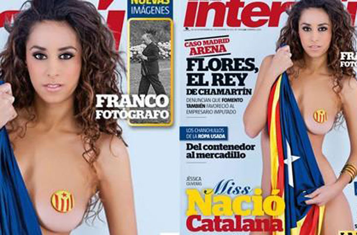 NOTICIAS 27/11/2012Critican a una Miss española por posar semidesnuda Coincidiendo con la semana postelectoral de Cataluña, "Interviú" ha hecho "campaña" a su manera con el desnudo de Jéssica Oliveras, última Miss Nación Catalana, la modelo posa arropada con la estelada (bandera no oficial vinculada al independentismo) en vez de con la bandera española.