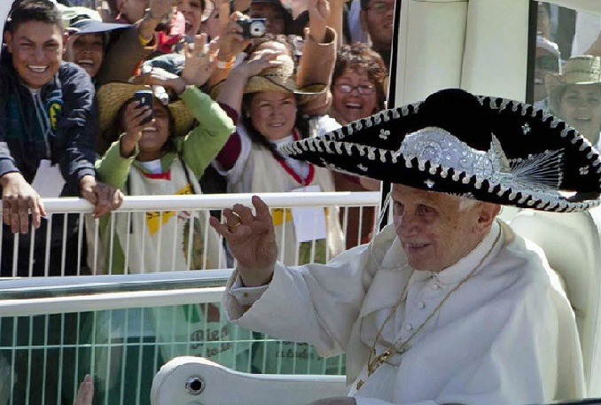 NOTICIAS 25/03/2012Benedicto XVI usa sombrero charro durante recorridoBenedicto XVI se dejó seducir por la afabilidad del pueblo mexicano y accedió a colocarse un enorme sombrero de charro mexicano este domingo cuando recorría en el papamóvil el camino hacia el altar donde celebró una multitudinaria misa en Silao.