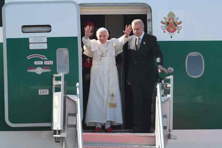 NOTICIAS 23/03/2012Recorrido del Papa Benedicto XVI en MéxicoTodo esta listo para que este viernes a las 16:30 horas arribe al Aeropuerto Internacional de Gunajuato Benedicto XVI. Será el Presidente Calderón quien de la bienvenida al Pontifice, tras la ceremonia de recepción iniciará el primer recorrido en el Papamóvil, a las 17:30 horas, rumbo al Colegio Miraflores.